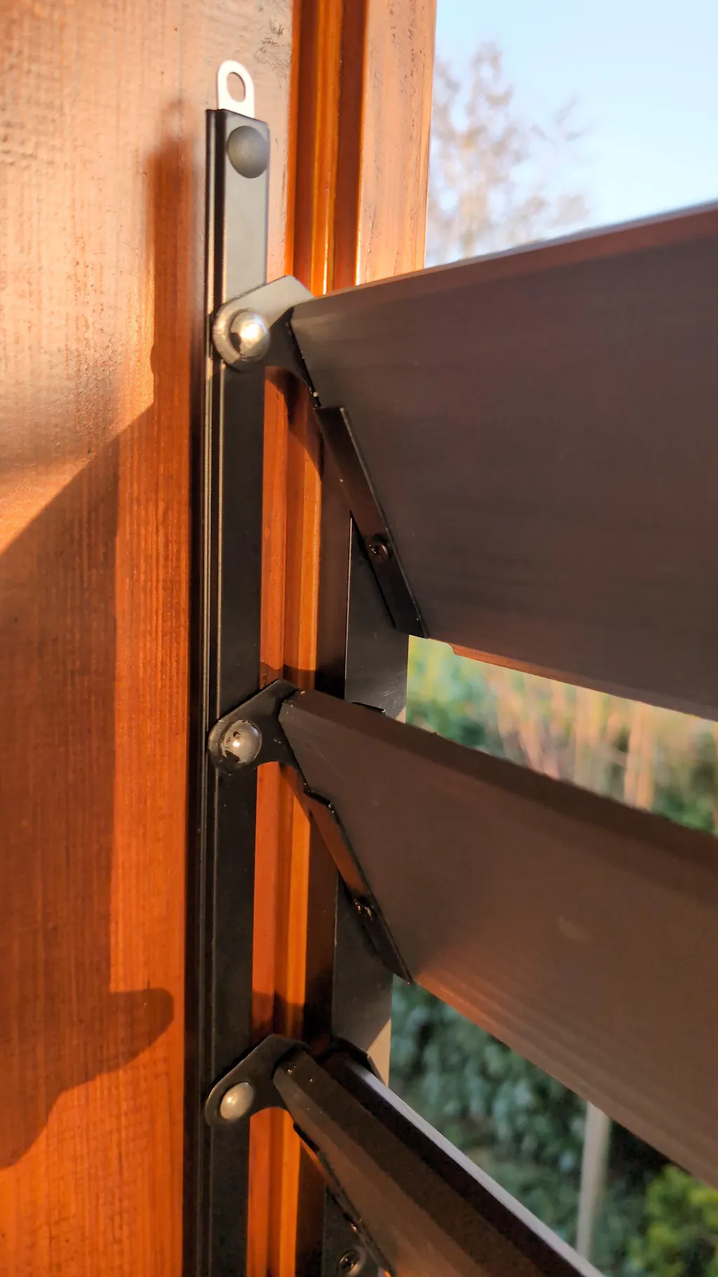 Die Mechanismen sind komplett aus Metall gefertigt, verzinkt und mit Korrosionsschutzfarbe pulverbeschichtet, was sie sehr langlebig macht und viele Jahre verwendet werden kann. Die Mechanismen können einfach und schnell kombiniert werden, indem beide Lamellen gemäß der Anleitung auf 11 mm gekürzt werden. Dies ermöglicht die Entwicklung großer Flächen.